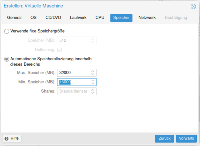 Und noch den Arbeitsspeicher (RAM). Hier kann fester oder dynamischer Speicher zugewiesen werden.